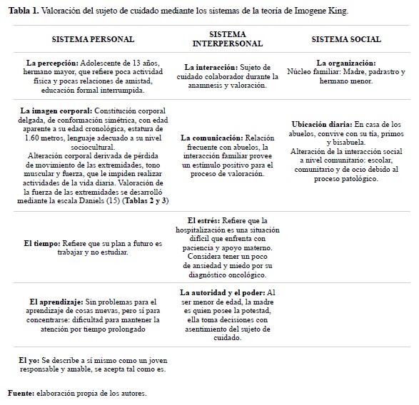 Tabla 1. Valoración del sujeto de cuidado mediante los sistemas de la teoría de Imogene King.