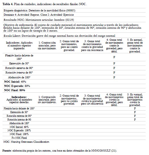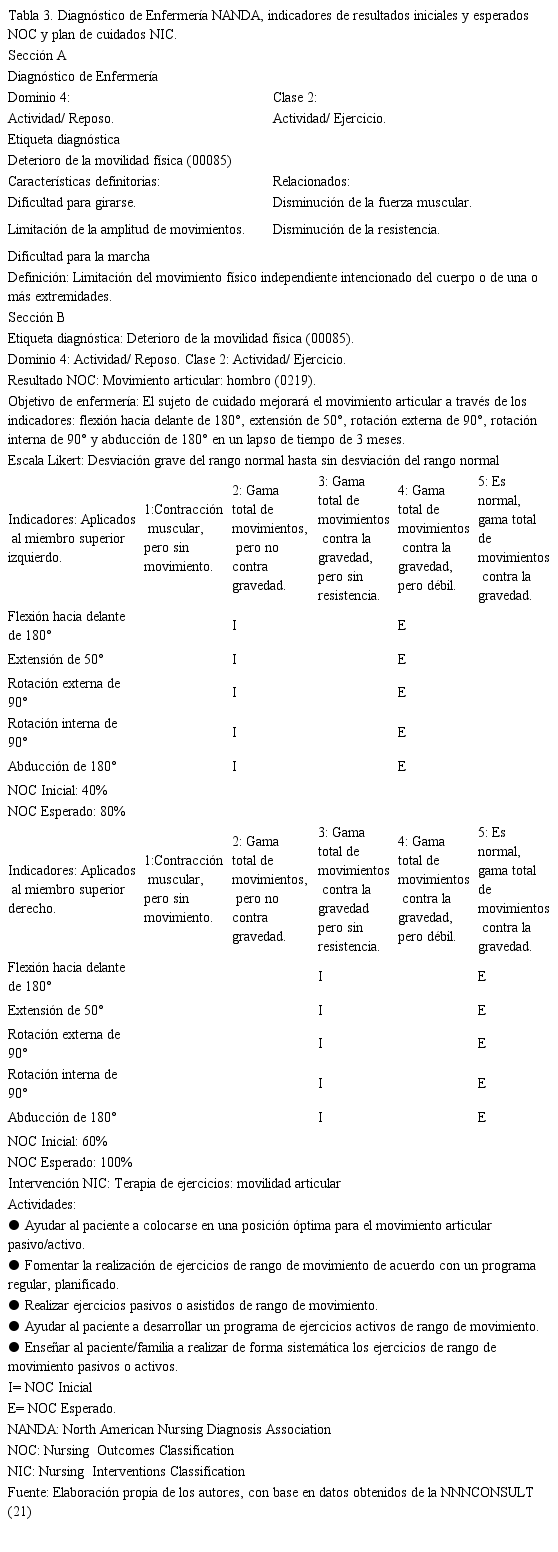 Para el diagnóstico identificado se desarrolló el objetivo NOC (22) con los indicadores asociados y la intervención NIC con sus actividades a realizar (23). Los indicadores NOC se plantearon mediante la integración de la escala Daniels a la escala Likert, describiendo la puntuación de los resultados dependiendo de la fuerza muscular de las extremidades superiores del sujeto de cuidado. (Tabla 3 sección B). El objetivo de enfermería planteado es: El sujeto de cuidado mejorará el movimiento articular a través de los indicadores: flexión hacia delante de 180°, extensión de 50°, rotación externa de 90°, rotación interna de 90° y abducción de 180° en un lapso de tiempo de 3 meses.