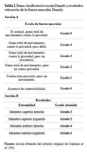 Tabla 2. Ítems clasificatorios escala Daniels y resultados valoración de la fuerza muscular Daniels.