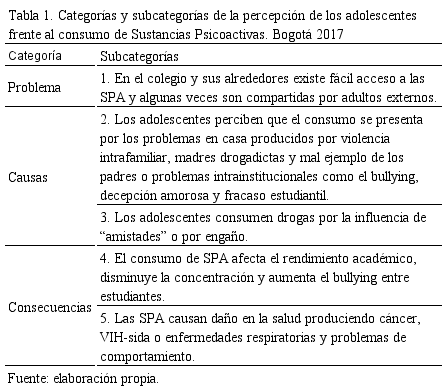 Tabla 1.Categorías y subcategorías de la percepción de los adolescentes frente al consumo de Sustancias Psicoactivas. Bogotá 2017