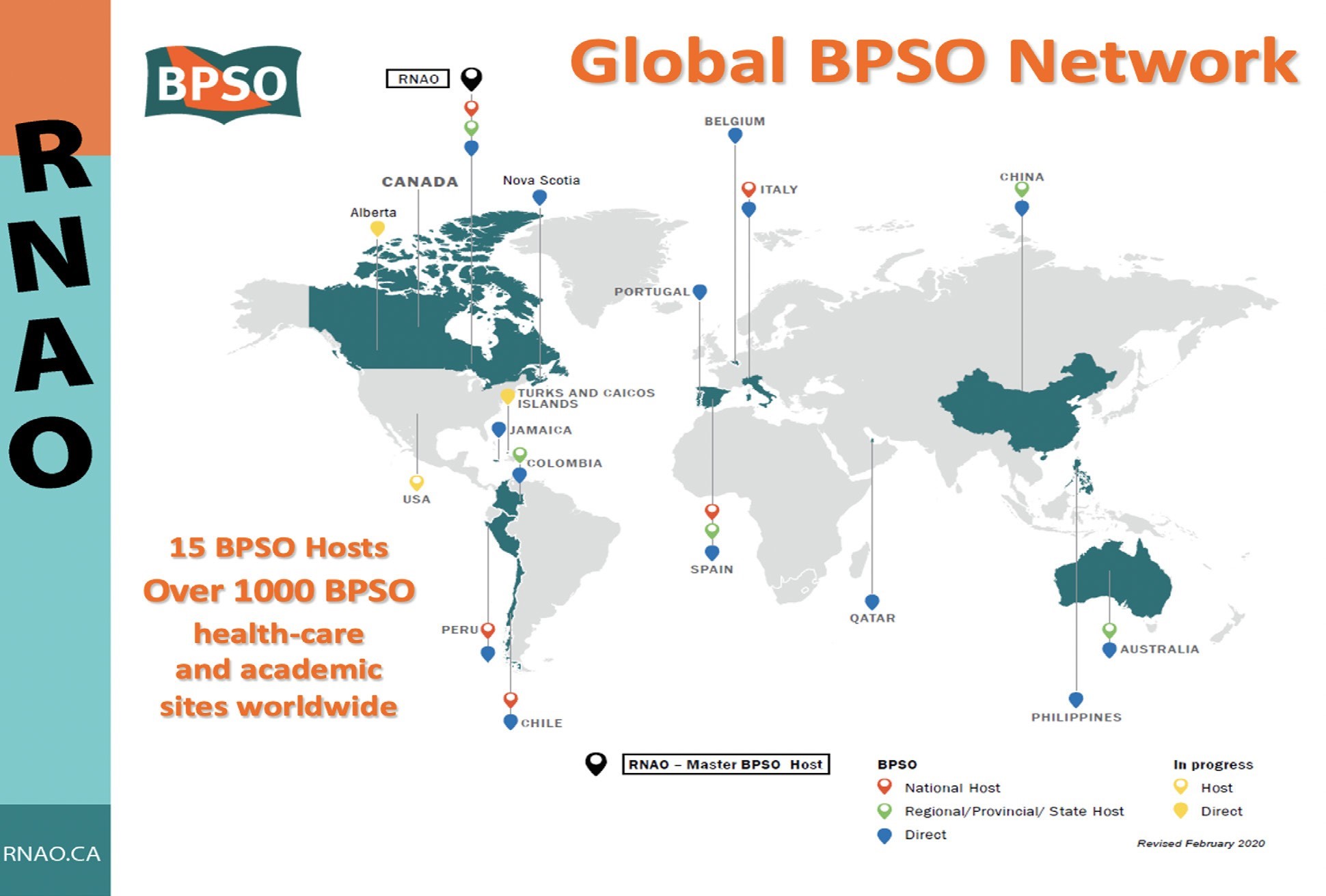 En 2010, el programa de guías de buenas prácticas abrió sus puertas a nivel internacional cuando el gobierno de España se acercó a RNAO y fue el primero en colaborar con la traducción de las guías al español y posteriormente, en apoyar la creación de una red de centros BPSO en ese país. Esto supuso una gran oportunidad, ya que España es un país con más de 46 millones de personas y 164,385 enfermeras (15). La traducción de las guías al español ha sido fundamental para permitir el acceso a las guías de buenas prácticas de RNAO a millones de enfermeras y demás profesionales sanitarios de habla hispana en todo el mundo. También llevó a vislumbrar un modelo que permitiría la expansión y la sostenibilidad de la acreditación de centros BPSO en países de habla hispana en el extranjero; de esta manera nació el concepto de Centro BPSO Coordinador, que coordina una red de centros BPSO. Recientemente la revista Enfermería Clínica sacó un monográfico que contiene seis manuscritos de los centros BPSO directos a RNAO y los centros BPSO de España, estos últimos gestionados por la organización de Investen, que tiene a su cargo alrededor de 300 BPSO directos en España (16).