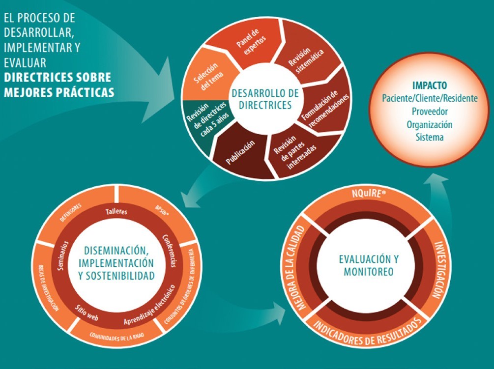 Es de reconocer que 1925 se creó la asociación enfermeras registradas de Ontario (RNAO), una organización independiente sin ánimo de lucro que representa a las Enfermeras con el solo fin de promover políticas sanitarias saludables para todos y excelencia en cuidados de Enfermería. En el año 1999 su Directora Ejecutiva, la Dra. Doris Grinspun, conceptualizó y lanzó el programa de directrices sobre mejores prácticas (BPG) subvencionado por el servicio del Ministerio de Salud de Ontario con el fin de promover cuidados de Enfermería de alta calidad (1). Las guías de buenas prácticas son “Declaraciones desarrolladas sistemáticamente para ayudar a los profesionales y a las decisiones del cliente sobre la atención clínica adecuada para circunstancias específicas” (2). La organización RNAO ha impulsado la creación e implementación de guías de práctica clínica, las cuales se basan en la mejor evidencia posible e incluyen recomendaciones para enfermeras y demás profesionales sanitarios, gestores, formadores y legisladores, para mejorar tanto los resultados clínicos como los del entorno laboral. Ofrecen una evaluación de la calidad de la literatura científica relevante y una valoración de los posibles beneficios y daños de una intervención en particular, permitiendo así que el profesional sanitario elija la mejor atención para el paciente en función de sus preferencias. El programa de guías de buenas prácticas de RNAO es integral, al incluir el desarrollo de las guías, el apoyo activo para la implementación, y un sistema internacional de datos para la evaluación de resultados denominado NQuIRE (3).