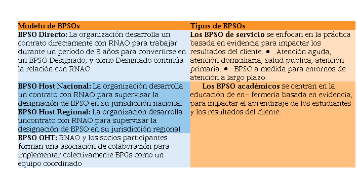 Hay dos modelos de BPSO para aquellas instituciones académicas y de atención sanitaria que se planteen solicitar la acreditación como centro BPSO (Tabla 1).