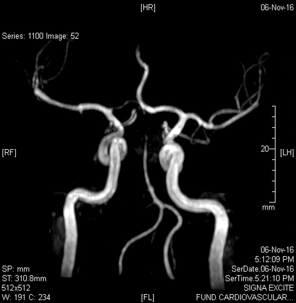 Figura 2. Angiorresonancia que muestra oclusión de arteria basilar a nivel de tercio distal.