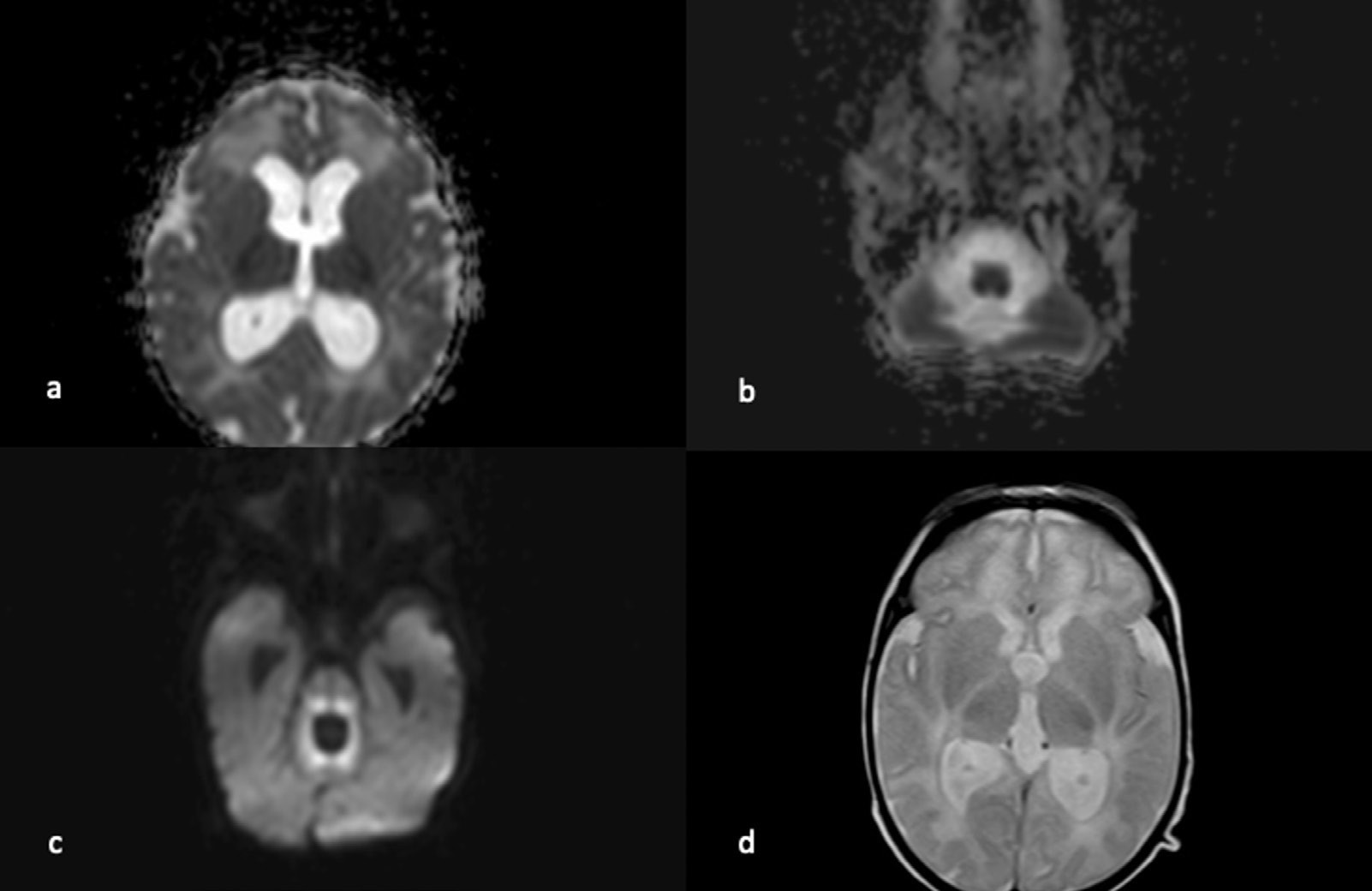 a. Imagen ADC con evidencia de restricción a la difusión de brazo posterior de la cápsula interna bilateral. b y c. Imágenes de difusión (ADC y b1000) con evidencia de restricción a la difusión en tegmento póntico y tractos bulbares dorsales. d. T2 axial: aumento de señal en brazo posterior de la cápsula interna.
