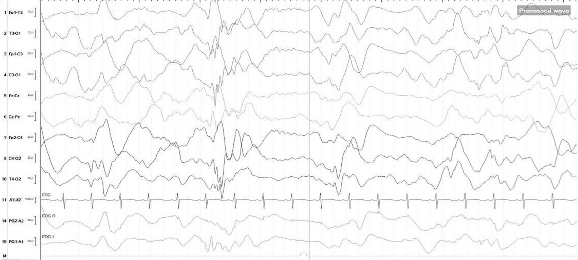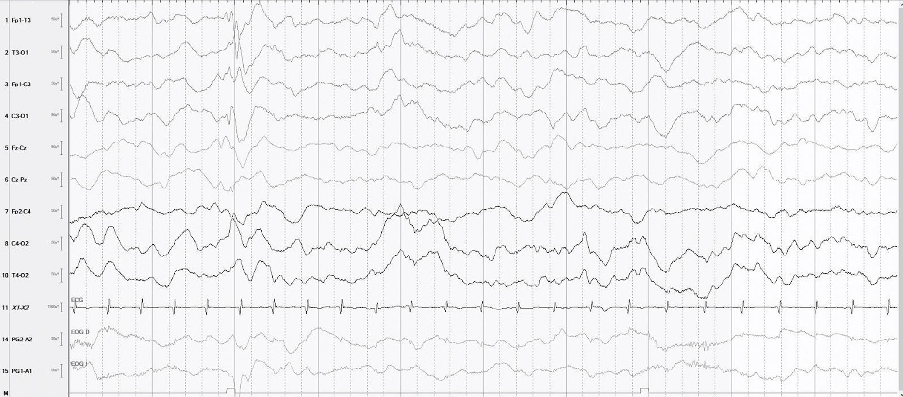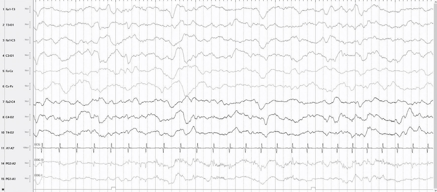 Fuente: tomado de la historia clínica del paciente.Figura 2.EEG (Sens 7mcv, TC 0.1s, HF 70 Hz) Lentificación intermitente difusa