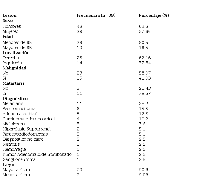 Abstract: Introduction. Masses found in the adrenal gland can be classified according to their origin, behavior, location, function and manner of diagnosis. In Colombia there are insufficient data describing the frequency and main histopathological characteristics of these lesions. The aim of this manuscript is to describe the main histopathological findings and malignancy of adrenal masses in a medical center specialized in pathology in Bucaramanga, Santander. Methodology. Descriptive and retrospective study. Pathologies of patients of all ages with histopathologic alterations in the adrenal gland were reviewed in a medical center in Bucaramanga, Santander. Results. Seventy-nine adrenal pathologies were reviewed, of which 39 showed adrenal gland lesions. The most frequent lesion found was metastasis (28.2 %), and the most frequent location of the lesion was in the right gland (62.1 %). Conclusion. It is essential that prospective studies be carried out to obtain epidemiological data in order to generate local data..