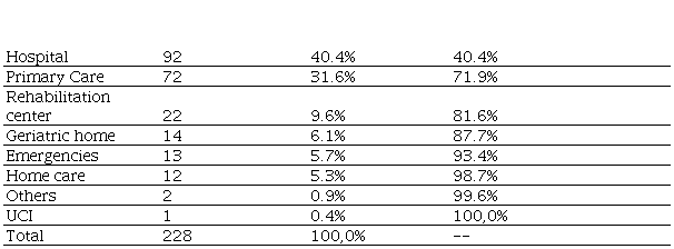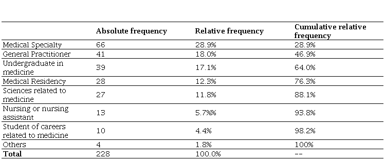 Source: prepared by the authorsThe practice settings where GeriatriApp was most frequently used were the hospital (40.1%), primary care (31.6%), rehabilitation centers (9.6%), and nursing homes (6.1%) (Table 2). In this variable, there was no imbalance in the distribution according to sex (p = 0.646). Regarding educational level, the most frequent users of the App were medical specialist (28.95%) general practitioners (18%), medical students (17.1%), residents (12.3%), and other occupations related to medicine (11.8%) (Table 3).