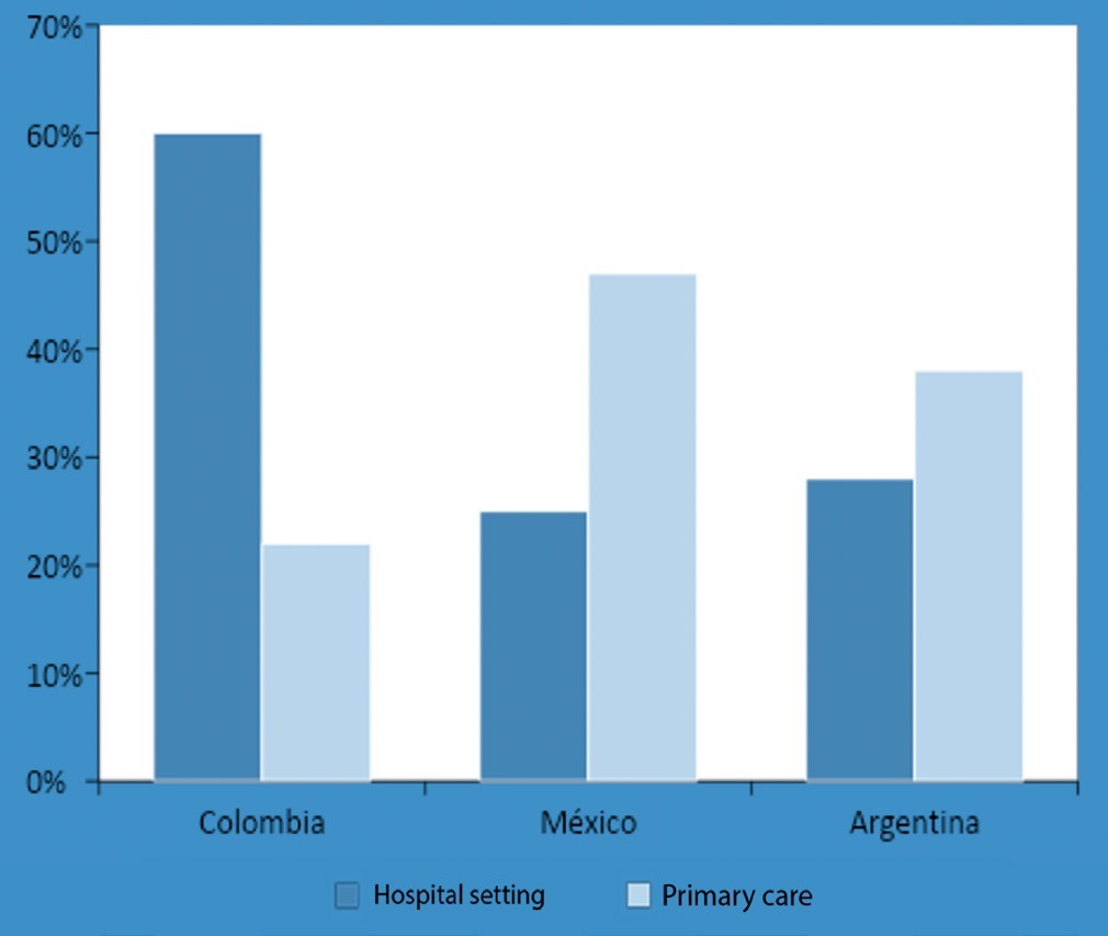 In Colombia, 60% of the respondents carried out their practice in hospitalization and 22% in primary care; in Mexico, 25% in hospitalization and 47% in primary care. In Argentina, 28% in hospitalization and 38% in primary care.