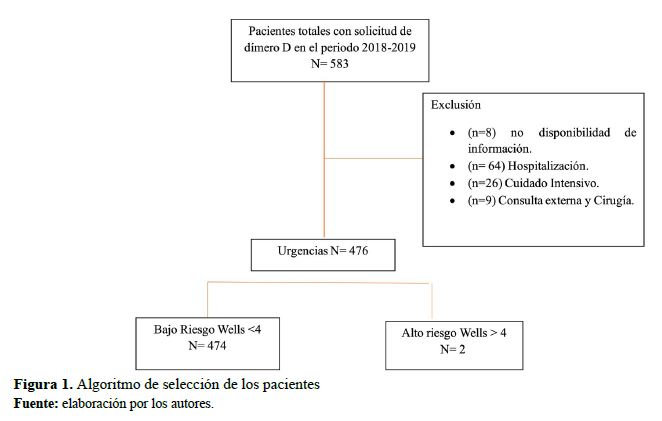 Estudio observacional, descriptivo, transversal y retrospectivo, con selección pacientes adultos mayores de 18 años que consultan al servicio de urgencias de una clínica de tercer nivel de la ciudad de Bogotá, Colombia, durante el periodo 2018-2019. A ellos se les solicitó dímero D en el servicio de urgencias. Los criterios de exclusión fueron pacientes sin información en su historia clínica, que se encontraran en servicios de hospitalización, UCI, cirugía o consulta externa.