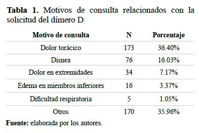 Tabla 1. Motivos de consulta relacionados con la solicitud del dímero D
