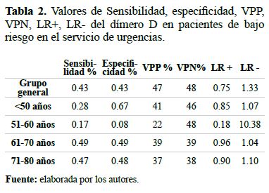 Tabla 2.Valores de Sensibilidad, especificidad, VPP, VPN, LR+, LR- del dímero D en pacientes de bajo riesgo en el servicio de urgencias.
