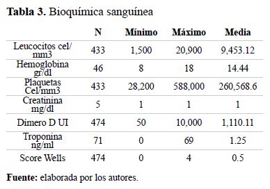 Del total de la población blanco el 35.9% presentaron un motivo de consulta no relacionado directamente con patología tromboembólica. Los paraclínicos de bioquímica sanguínea se muestran en la Tabla 3. El promedio del Score de Wells en los pacientes incluidos fue de 0.5 puntos. La mayoría de los exámenes tenían un valor promedio dentro de la normalidad y el promedio del valor de troponina estuvo por encima del rango de referencia del laboratorio de la institución (valor de referencia = 0.01-0.04).