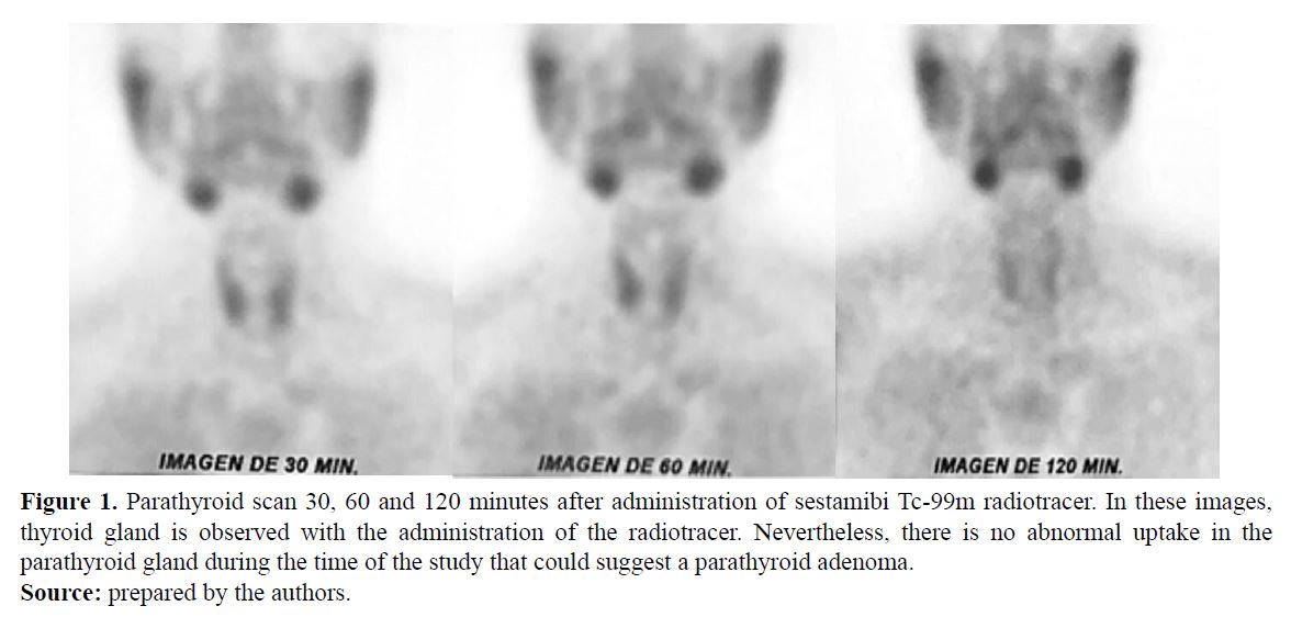 Figure 1.Parathyroid scan 30, 60 and 120 minutes after administration of sestamibi Tc-99m radiotracer. In these images, thyroid gland is observed with the administration of the radiotracer. Nevertheless, there is no abnormal uptake in the parathyroid gland during the time of the study that could suggest a parathyroid adenoma.