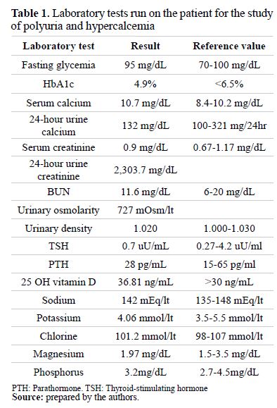 Table 1.Laboratory tests run on the patient for the study of polyuria and hipercalcemia
