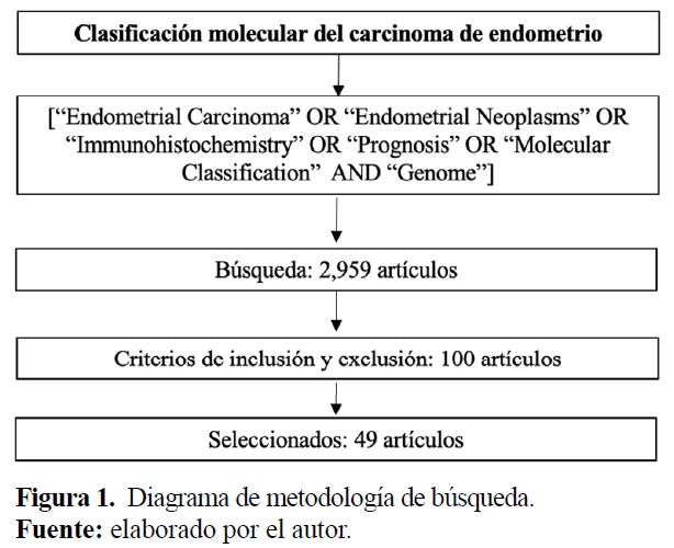 Se realizó una búsqueda en Medline, Science Direct y Cochrane de artículos originales y de revisión publicados desde el año 2014 hasta el 2020 en idioma inglés y español. Se utilizaron términos “endometrial carcinoma” [MeSH] OR “endometrial neoplasms” [MeSH] OR “immunohistochemistry” [MeSH] OR “prognosis” [MeSH] OR “molecular classification” [MeSH] AND “genome” para la búsqueda. Los criterios de inclusión fueron artículos originales y de revisión de los últimos 6 años que en el título y abstract describieran la clasificación molecular del carcinoma de endometrio y la relación de ésta con el diagnóstico histopatológico, tratamiento y pronóstico. Se excluyeron los artículos con idioma diferente al inglés o español, artículos duplicados, estudios en animales, con contenido insuficiente o los que no se relacionaran con el objetivo de esta revisión.