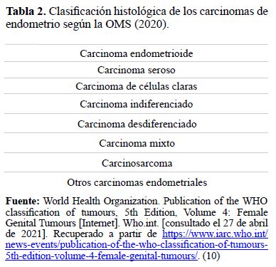 Tabla 2. Clasificación histológica de los carcinomas de endometrio según la OMS (2020).