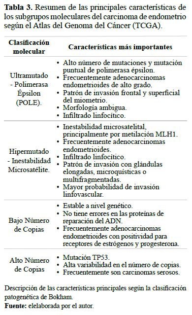 El Atlas del Genoma del Cáncer (TCGA) realizó el análisis molecular más completo de la actualidad para evaluar los componentes moleculares del CE. Este comprendió el estudio de la secuenciación del genoma, la secuenciación del Exoma, ensayos de Inestabilidad microsatelital (MSI) y el análisis del número de copias somáticas (17). Se estudiaron 232 CE y de acuerdo a los resultados se clasificaron en cuatro subgrupos: Ultramutado– Polimerasa Épsilon (POLE), Hipermutado–Inestabilidad Microsatélite, Bajo Número de Copias y Alto Número de Copias. Cada subgrupo presenta diferentes aberraciones genómicas y se correlaciona con la supervivencia (18) (Tabla 3).
