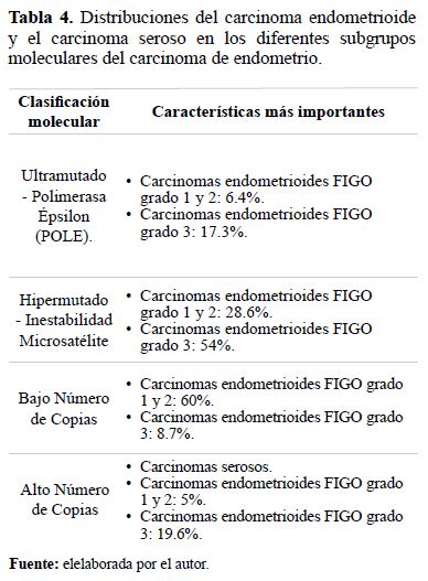 Tabla 4.Distribuciones del carcinoma endometrioide y el carcinoma seroso en los diferentes subgrupos moleculares del carcinoma de endometrio.