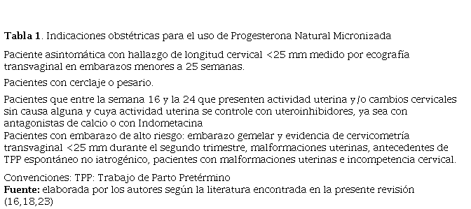 Con controversia ha sido documentado el uso de la progesterona en el campo obstétrico, Además, es evidente la falencia en la Guía de Práctica Clínica colombiana de recomendaciones para el manejo, en los diferentes niveles de atención, del TPP. Es en este aspecto que radica la importancia del abordaje del tema expuesto, que se realiza con el fin de aportar pautas concisas y actualizadas, y considera fundamental que, tanto en el ejercicio de la medicina general como especializada (Obstetricia), sea ampliamente conocido el uso de la progesterona natural micronizada. Así, de ser posible, se manejará de manera temprana y se reducirá al mínimo la probabilidad de que una complicación asociada surja. Esto garantiza una atención médica de adecuada calidad.