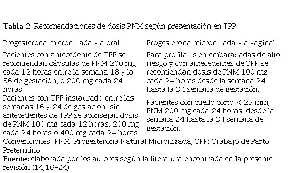 Como se expuso de manera previa, en la literatura no es posible encontrar pautas concisas e internacionalizadas sobre el uso de la progesterona micronizada frente a la amenaza de TPP, lo que controvierte su evidencia. Para la mitigación del TPP, según lo analizado por los autores del presente estudio, se recomienda el uso de la progesterona micronizada en gestantes de alto riesgo: PNM cápsulas de 100 mg vía oral cada 24 horas desde la semana 24 hasta la semana 34 de gestación.