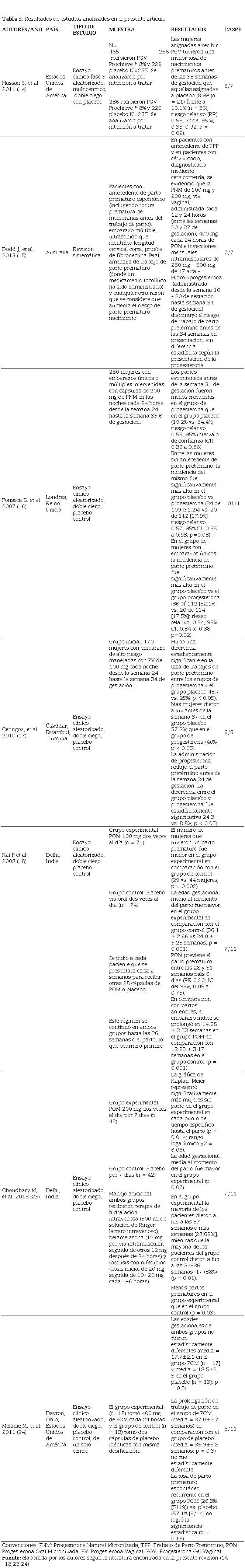 Los autores graficaron a manera de tablas las indicaciones y dosis de PNM vía vaginal y oral junto con los resultados de los diversos estudios recolectados durante la búsqueda (Tabla 1–3).