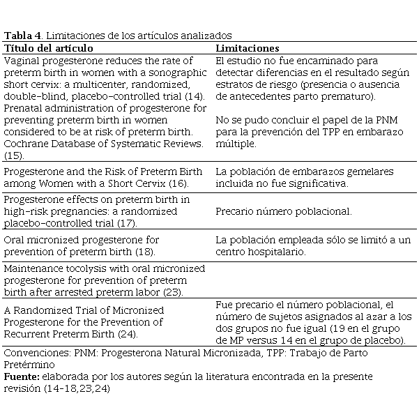 En la presente revisión sistemática se incluyeron artículos con números poblacionales significativamente bajos, por este motivo se ve afectado el nivel de validez interna. Asimismo, las fechas de publicación incluyen artículos de hace 10 años y/o más aproximadamente. En cuanto a las variables estudiadas, no se incluyeron los efectos adversos en las madres ni en los neonatos, lo que representa una limitación en las conclusiones obtenidas y su extrapolación (Tabla 4).