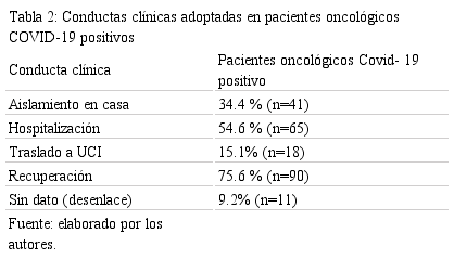 Tabla 2. Conductas clínicas adoptadas en pacientes oncológicos COVID-19 positivos