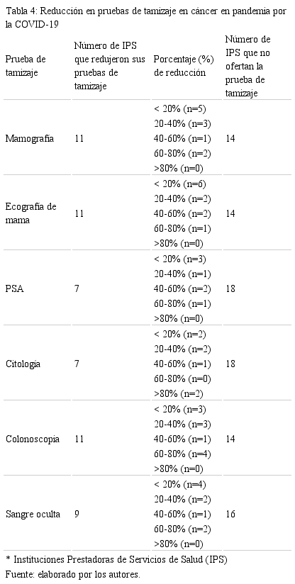 Al comparar la actividad habitual de los servicios, el 48% de las IPS evidenció disminución en el tamizaje de cáncer. En orden de relevancia se observó una disminución en la realización de las colonoscopias, las mamografías y las ecografías de mama, el antígeno prostático específico (PSA) y la citología (Tabla 4).