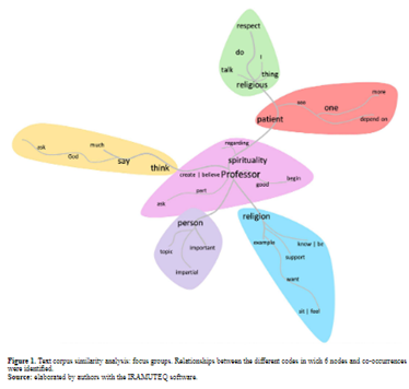Similarity Analysis (Focus Groups): it allowed seeing the relationships between different codes, in which 6 nodes were identified, each one comprised by codes and strong co-occurrences between the professor, spirituality, person, religion, patient and thought codes. This analysis will help students approach the concept of spiritual care in the identified categories (Figure 1).