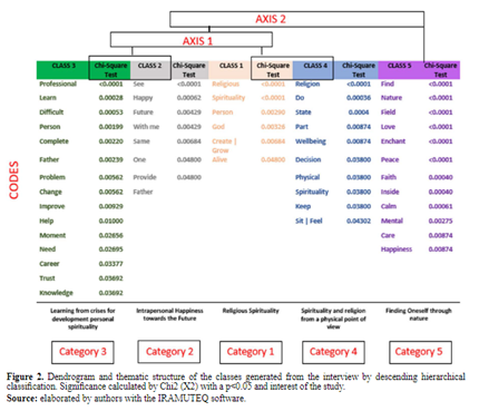 Phase three: determining the coding system for the structural stage. The first structuring was carried out from the thematic axes that arose from analyzing the transcribed texts, with the help of the IRAMUTEQ software. An analysis was carried out in which the first concurrencies between each one of the codes were drawn, generating the word tree with them. Subsequently, phrases with fundamental meanings were selected from the experience, regarding spirituality and spiritual care.