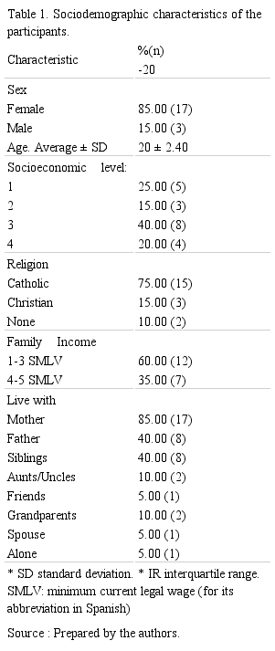 Table 1 shows the characteristics of the population of students of the Nursing program who participated in the study. Most were female (85%), with an average age of 20, and most were in stratum 3 (40%), catholic (45%) and living with their mothers (85%).