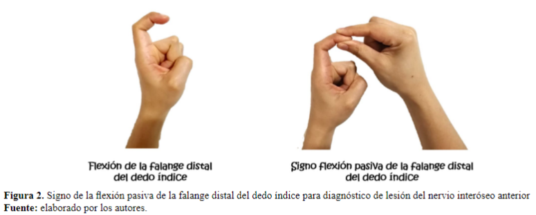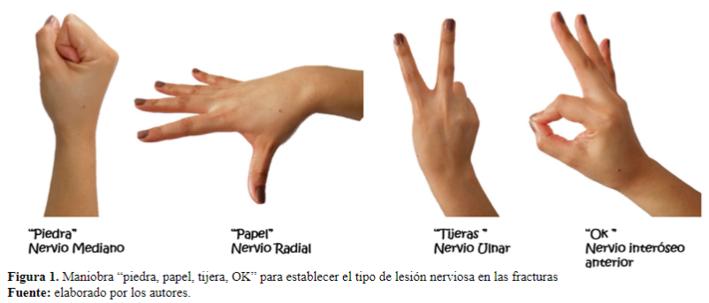Una vez el padre o representante legal del paciente autorizó su participación en el estudio mediante la firma del consentimiento informado, se procedió a la recolección de los datos sociodemográficos como la edad, el sexo y la procedencia, así como información del mecanismo del trauma, lugar en el que ocurrió la lesión, miembro dominante, lateralización y exposición de la fractura. A su vez, se realizó una evaluación clínica del estado neurológico y vascular de la extremidad afectada de conformidad con el modelo expuesto por Shenoy y colaboradores (11) al momento de la consulta inicial y posterior a la intervención quirúrgica. Este modelo consiste en pedirle al niño que realice la maniobra “piedra, papel, tijera, OK” para la evaluación nerviosa motora, piedra corresponde a la función del nervio mediano, papel del nervio radial, tijeras nervio cubital y OK al nervio interóseo anterior; además, se complementó con la abducción del pulgar (nervio mediano) y abducción de los dedos de la mano (nervio ulnar) y el signo de la flexión pasiva de la falange distal del dedo índice para el nervio interóseo anterior (Figuras 1y 2).