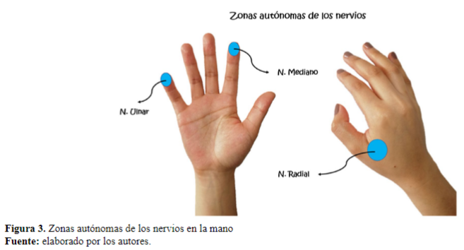El examen sensorial se realizó verificando las zonas autónomas de los nervios para evitar confusiones, el pulpejo del dedo índice es exclusivo del nervio mediano, el pulpejo del dedo meñique exclusivo del nervio ulnar y el dorso de la base del pulgar exclusivo para el nervio radial (Figura 3). La revisión radiográfica se efectuó por el software de Hiruko PACTS en donde se clasificó la fractura según clasificación de Garland.