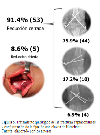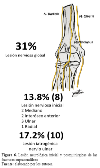 El 91.37% de las fracturas fueron tratadas con reducción cerrada y fijación percutánea, siendo el 75.9% con fijación cruzada (con un pin medial y uno lateral) (Figura 5). Respecto al estado vascular inicial y posterior al manejo quirúrgico, ningún caso presentó alteración en los pulsos, llenado capilar y gradiente térmico distal. La lesión neurológica en general fue de un 31%, la lesión nerviosa al ingreso fue de 13.79%, distribuidos de la siguiente forma: ulnar 5.17%; mediano 3.34%; interóseo anterior 3.34%; y radial 1.72%. En el 17.24% se presentó lesión iatrogénica nervio ulnar (Tabla 2), (Figura 6).