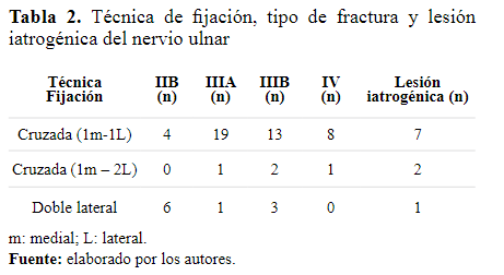 La técnica de fijación cruzada fue la de preferencia por los ortopedistas del estudio, lo que podría explicar un 17.2% de lesión iatrogénica del nervio ulnar, muy similar a lo descrito en la literatura, en donde el pin medial se asocia a prevalencias de lesión ulnar que van desde un 1.4% a un 17.7% (5,21-23). En un estudio de cohorte retrospectivo realizado en el Instituto Roosevelt en la ciudad de Bogotá entre el 2010 al 2012 en 141 pacientes con fracturas supracondíleas Gartland III - IV, la lesión nerviosa posquirúrgica fue del 12.8%, siendo el nervio ulnar el más afectado (24). Otra explicación razonable a la alta prevalencia de lesión iatrogénica es que el HUS es un centro de práctica para los ortopedistas en formación, y a medida que realizan la curva de entrenamiento las lesiones son un poco más frecuentes.