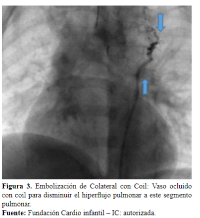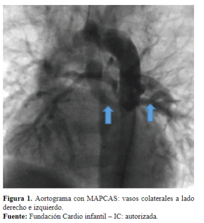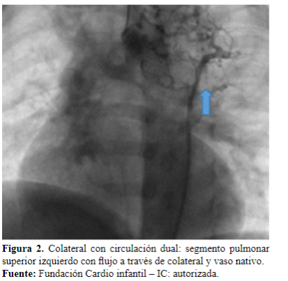 Como motivo de consulta, por presentar un cuadro clínico de síncope, asociado inicialmente a una crisis convulsiva. Se le realiza un ecocardiograma y un cateterismo cardíaco, con los cuales se define el diagnóstico de atresia pulmonar con comunicación interventricular (CIV), sexto arco pequeño. Dos colaterales derechas: una superior que nutre segmentos del lóbulo inferior derecho, otra inferior más grande que nutre todas las porciones restantes del pulmón derecho. Una colateral izquierda que nutre todo el pulmón izquierdo y el sexto arco pequeño (Figura 1).