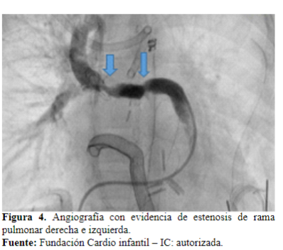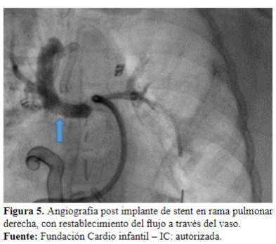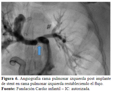 Dos días después es llevada a cateterismo cardíaco para ampliar estudios, donde se evidencia estenosis en la unión de la rama derecha con el conducto (Figura 4). Se realiza angioplastia con stent, queda con buena luz y buen flujo en el pulmón izquierdo (Figura 5y 6).