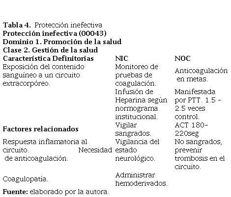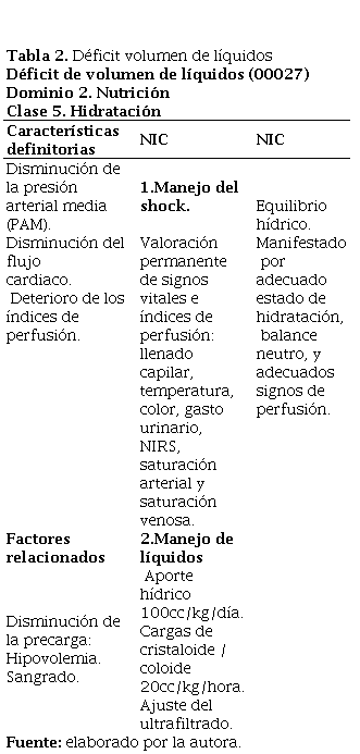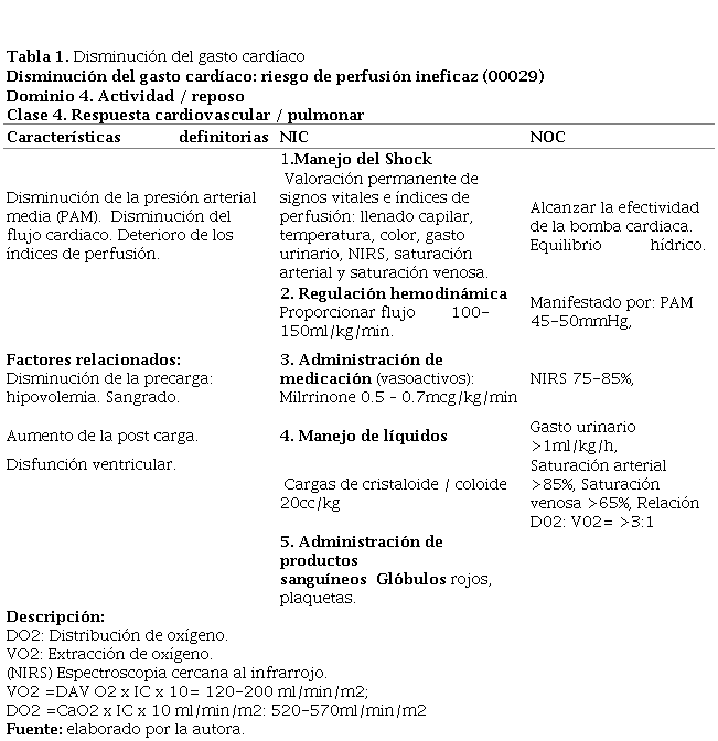 Posteriormente, en las tablas 1-5, se presenta el enfoque del plan de atención de enfermería para “JOL” en las primeras horas bajo la metodología NNN: North American Nursing Diagnosis Association (NANDA), Clasificación de Intervenciones de Enfermería (NIC) y Clasificación de Resultados de Enfermería (NOC). La corrección quirúrgica de esta cardiopatía transcurre con una manipulación del miocardio, de los vasos que conforman las colaterales y del tronco pulmonar, lo que requiere tiempo en circulación extracorpórea prolongado, generando respuesta inflamatoria importante, injuria y liberación de varios mediadores pro inflamatorios, posterior disfunción multi órgano, coagulopatía, y labilidad. El profesional de enfermería debe realizar una valoración ágil y completa, priorizar problemas de salud, discernimiento de los diagnósticos de enfermería de los cuales derivan objetivos y las respectivas intervenciones. Figuran como elementos clave adecuado manejo hídrico con hemoderivados, coloides y cristaloides para soportar la volemia, ofrecer óptima oxigenación, y manejo de defectos residuales con el uso de tecnología del equipo interdisciplinar, y acompañamiento empático a los padres.