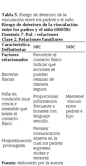 Tabla 5. Riesgo de deterioro de la vinculación entre los padres y el niño