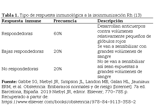 La respuesta inmunológica de una gestante Rh negativa contra células Rh positivas se divide en tres grupos: las respondedoras, que producen anticuerpos contra volúmenes relativamente pequeños de glóbulos rojos, las no respondedoras que no se sensibilizan bajo ningún estímulo y las bajas respondedoras que deben exponerse a un alto volumen de sangre para poder sensibilizarse (Tabla 1). Así mismo, las repercusiones sobre el feto van a ser nulas en las no respondedoras y de menor impacto en las bajas respondedoras, aunque epidemiológicamente las respondedoras son predominantes (4).