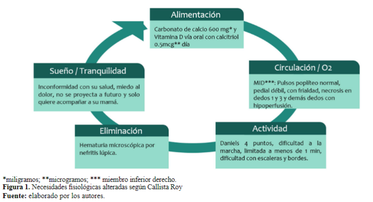 Abstract: Introduction. Rhupus syndrome is the overlap of two autoimmune diseases, rheumatoid arthritis or juvenile idiopathic arthritis, and systemic lupus erythematosus, with a prevalence of 7-401 per 100,000 children. Felty’s syndrome is characterized by the triad of juvenile idiopathic arthritis, splenomegaly, and neutropenia; experiencing more than one rheumatic pathology is a rare phenomenon estimated between 0.01-2%. Objective. Describe the comprehensive nursing care process in an adolescent with Rhupus and Felty’s syndrome, under the adaptation model of Callista Roy. Methodology. Nursing case study of a 15-year-old patient selected in pediatric hospitalization, with prior informed consent; intervened through the structured nursing care process according to the taxonomy of the North American Nursing Diagnosis Association, the Nursing Outcomes Classification, and the Nursing Interventions Classification, with in-hospital interventions and follow-up through tele-nursing. Results. Improvement in ambulation and coping with problems evidenced by the increased well-being of the patient and the family. Conclusions. Faced with an unknown disease, the nursing care process, with direct interventions and continuous support, allows for comprehensive care to achieve the adaptation of the patient and her family.