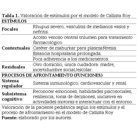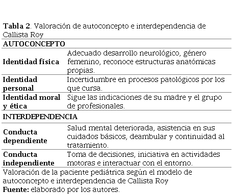 Rol-primario: adolescente; rol-secundario: hija; rol- terciario: paciente y estudiante. Modos de adaptación función fisiológica (Figura 1), las necesidades son actividad, circulación/O2 y sueño/tranquilidad; valoración de estímulos focales, contextuales y residuales; y el proceso vulnerable de afrontamiento, autoconcepto e interdependencia que tiene la paciente (Tablas 1 y 2), con respuesta no adaptativa ante cambios determinados por la situación de salud (5).