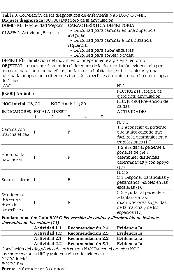 Fase de planeación: la meta seleccionada para mejorar la capacidad física alterada en la paciente fue ambular, con de la NOC: disminuir el deterioro de ambulación evidenciado en características definitorias en un lapso de un mes. Puntuación escala Likert NANDA-I: 1 = gravemente comprometido, 2 = sustancialmente comprometido, 3 = moderadamente comprometido, 4 = levemente comprometido y 5 = no está comprometido. NOC-inicial de (30%) y SIS-16 con nivel de dependencia moderada. Operativización desarrollada con NIC: 1) terapia de ejercicios deambulación y 2) prevención de caídas, integrando la Guía de Buenas Prácticas Clínicas de Registered Nurses’ Association of Ontario (RNAO): Prevención de caídas y disminución de lesiones derivadas de las caídas (Tabla 3) (10,11).