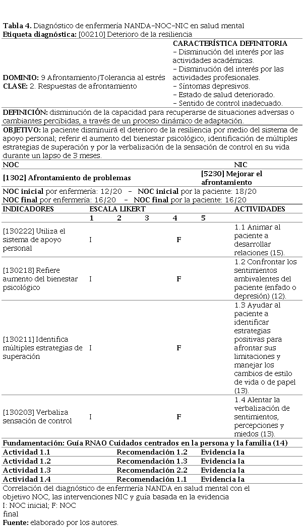 Fase de planeación: NOC afrontamiento de problemas. Disminuir el deterioro de la resiliencia evidenciado en características definitorias en un lapso de un mes. Puntuación escala Likert NANDA-I: 1 = nunca demostrado, 2 = raramente demostrado, 3 =a veces demostrado, 4 = frecuentemente demostrado, 5 = siempre demostrado. NOC-inicial por enfermería: 12/20 y NOC-inicial por la paciente: 18/20. Escala RS-14, nivel de resiliencia bajo. La operativización se desarrolló con el NIC Mejorar el afrontamiento, fundamentado con la guía de cuidado centrado en la persona y la familia de la RNAO (Tabla 4) (10-14).