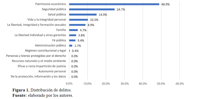 Las personas privadas de la libertad abordadas se encontraron, entre otros, vinculadas de mayor a menor, por delitos en contra del patrimonio económico, contra la seguridad pública, contra la salud pública, por delitos contra la vida y la integridad personal, por delitos contra la integridad y formación sexuales, y contra la familia (Figura 1), arrojando, en términos generales, gran similitud con la repartición delincuencial en el medio carcelario.