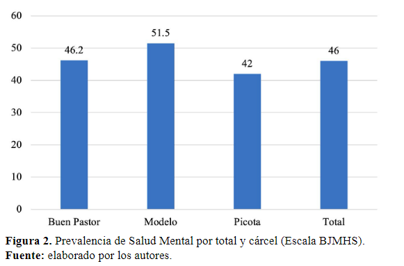 La prevalencia de afectaciones en la salud mental en todos los establecimientos, según la escala BJMHS, fue de 46.0%, con un IC de 95% (41.3% a 50.8%) (error de muestreo del 5.3%, calidad buena), para la cárcel Buen Pastor fue de 46.2% con un IC 95% (35.9% a 56.6%), para la cárcel Modelo 51.5% con un IC 95% (43.0% a 60.0%) y para la cárcel Picota con un 42.0% con un IC 95% (34.9% a 49.1%) (Figura 2).