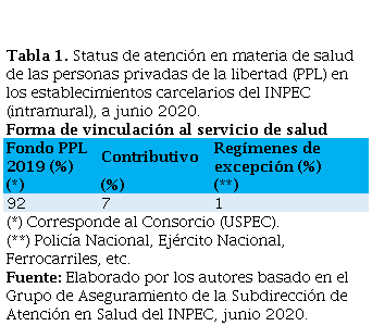 Tabla 1. Status de atención en materia de salud de las personas privadas de la libertad (PPL) en los establecimientos carcelarios del INPEC (intramural), a junio 2020