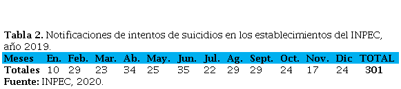 Tabla 2. Notificaciones de intentos de suicidios en los establecimientos del INPEC, año 2019.