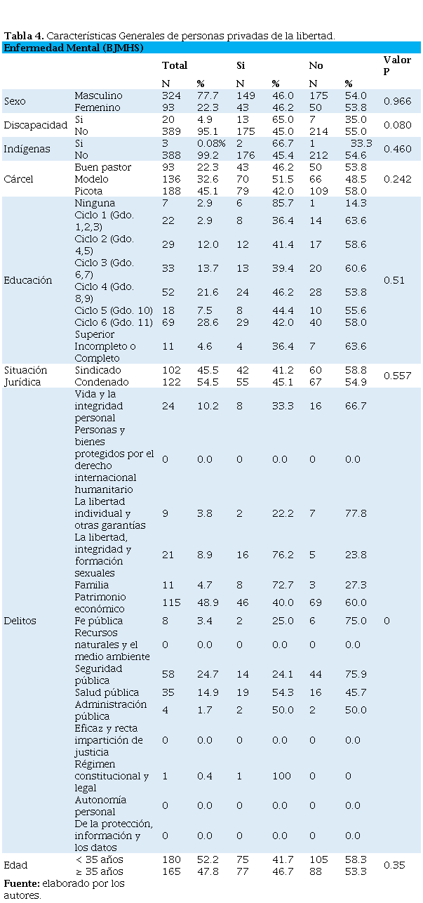 El sexo masculino fue el predominante con una mayoría de integrantes menores de 35 años que en un 4.9% manifestaron tener alguna discapacidad. Con respecto a la situación jurídica predominó el condenado. De igual forma, en todos los establecimientos se encontró una asociación entre los delitos y el trastorno mental (Escala BJMHS) (p<0.05) (Tabla 4).